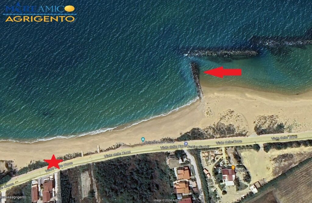 Questa è la proposta (in economia) di MareAmico, per salvare la strada del viale delle dune a San Leone… E’ necessario ed urgente smontare gradualmente il pennello perpendicolare indicato dalla freccia e trasportare i massi recuperati nella vicina zona attualmente aggredita dall’erosione. Dietro questa proposte – assicura Lombardo – ci sono fior di tecnici.