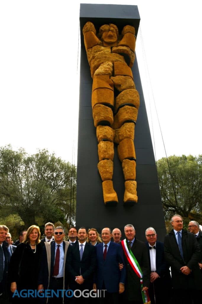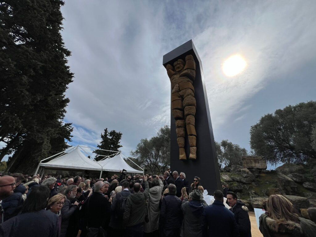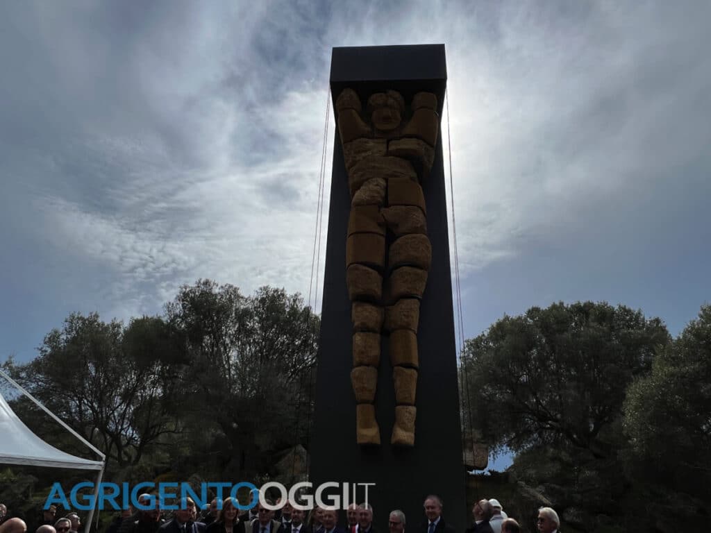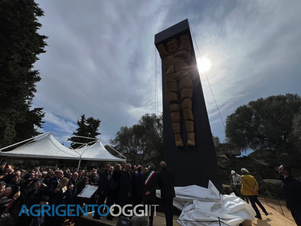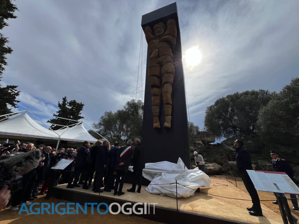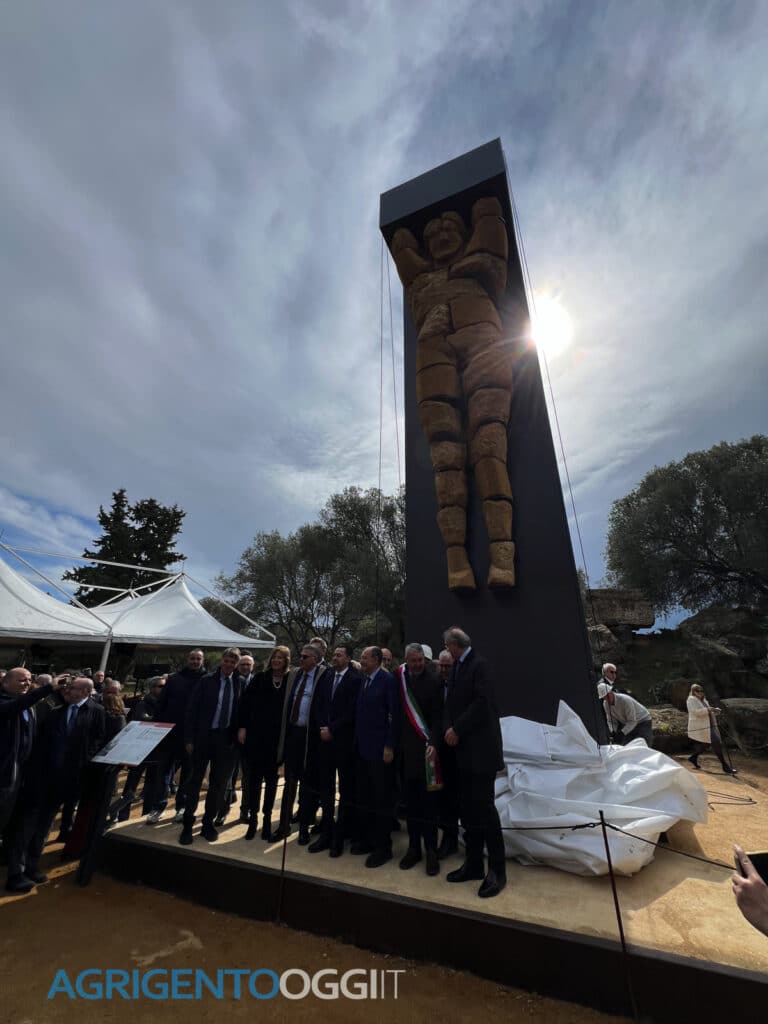 Un colosso di quasi otto metri di altezza, ai piedi di quello che fu il Tempio Di Giove Olimpico è stato “svelato” questa mattina nella Valle dei Templi di Agrigento. Alla cerimonia, tra le diverse autorità presenti, il presidente della Regione siciliana, Renato Schifani, l’assessore regionale ai Beni culturali, Francesco Paolo Scarpinato, il direttore del Parco archeologico e paesaggistico della Valle dei templi, Roberto Sciarratta; il deputato regionale Riccardo Gallo, il sindaco di Agrigento, Francesco Miccichè, il prefetto Filippo Romano e il curatore del progetto di musealizzazione, Carmelo Bennardo. Il progetto di anastilosi che ha visto la ricostruzione di uno dei Telamoni di uno dei più grandi templi dorici dell’ età classica, è stato curato dall’esperto scientifico, Alessandro Carlino. L’ imponente gigante alto 8 metri è stato ricostruito grazie ad un lungo lavoro di studio e assemblaggio di blocchi di pietra originale che giacevano all’ interno del parco. A sorreggerlo un’impalcatura in acciaio di 10 metri di altezza. Un’ opera che arricchisce ancora di più l’ area archeologica in vista dell’ anno 2025 di Agrigento Capitale della Cultura.