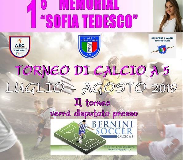 Si svolgerà ad Agrigento presso l’ impianto sportivo “Bernini Soccer” il 1° Memorial Sofia Tedesco. La famiglia Tedesco con la preziosa è sentita partecipazione dell’ A.S.C. e della tipografia Tredici.8 e di tantissimi sponsor che hanno contribuito a questo evento per l’ unico scopo ovvero rimarcare il senso di aggregazione per grandi e piccoli nel nome di Sofia morta tragicamente in un incidente stradale avvenuto circa un anno fa. Al Memorial parteciperanno 6 squadre suddivise in 2 gironi è la partita inaugurale sarà Mercoledì 10 Luglio ore 22:00, per tale occasione la macchina organizzativa con in testa la famiglia Tedesco invita tutta la cittadinanza a partecipare a questo evento e per ribadire nel ricordo di Sofia lo Stop alle stragi sulle strade.