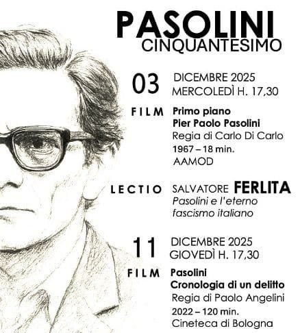 Nell’anno del cinquantesimo anniversario della morte, il Centro Culturale Pier Paolo Pasolini di Agrigento annuncia due appuntamenti speciali dedicati alla figura e all’eredità intellettuale dell’intellettuale, scrittore e poeta scomparso tragicamente, e misteriosamente, nel Lido di Ostia. Il primo momento di confronto è previsto per mercoledì 3 dicembre 2025 alle 17:30 con la proiezione del film “Primo piano. Pier Paolo Pasolini” per la regia di Carlo Di Carlo.