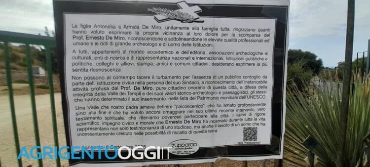 Nel manifesto, le figlie ringraziano quanti hanno espresso vicinanza e affetto. Ma non manca una nota polemica: viene infatti sottolineata l’assenza di un pubblico cordoglio da parte dell’amministrazione comunale, nella persona del Sindaco. Una mancanza definita “motivo di turbamento”, soprattutto considerando il legame profondo che De Miro aveva con Agrigento e la sua instancabile attività a difesa dei valori storici e paesaggistici della città.