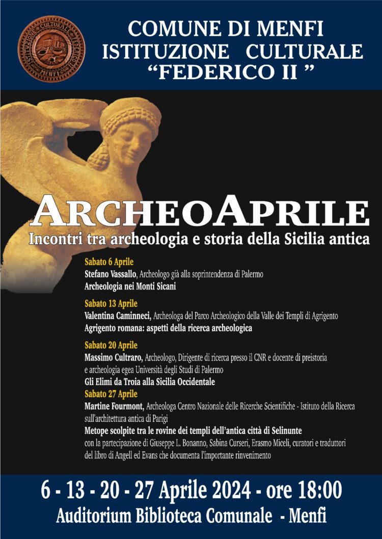 L’istituzione Culturale “Federico II” di Menfi propone la manifestazione “ArcheoAprile” un ciclo di incontri tra archeologia e storia della Sicilia antica organizzati in collaborazione e con la partecipazione di prestigiosi archeologi e studiosi della Sicilia antica che relazioneranno sulle avvincenti scoperte e le fruttuose campagne di scavo realizzate nei siti archeologici del territorio. Previsti quattro appuntamenti, a partire da sabato 6 aprile 2024 alle ore 18:00, presso l’Auditorium della Biblioteca Comunale di Menfi, attigua alle sale espositive dell’istituendo Museo di Palazzo Pignatelli, al fine di far conoscere sempre più l’immenso patrimonio storico archeologico della Sicilia.