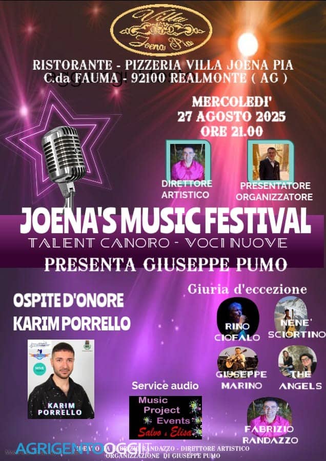 REALMONTE – Mercoledì 27 agosto, alle ore 21, presso il ristorante pizzeria Villa Joena Pia in contrada Fauma, andrà in scena il Joena’s Music Festival – Talent Canoro Voci Nuove, una serata interamente dedicata alla musica e ai giovani talenti.