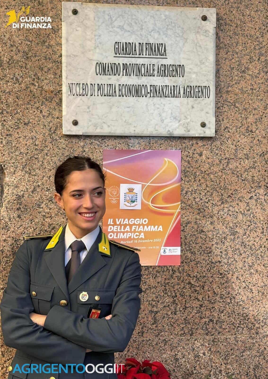 Martedì 16 dicembre 2025, in occasione del passaggio della Fiamma Olimpica per la città di Agrigento, anche la Guardia di finanza sarà rappresentata tra i tedofori chiamati a accompagnare la fiaccola partita lo scorso 6 dicembre da Roma nel suo viaggio verso i Giochi Olimpici di Milano Cortina 2026. Tra gli atleti che si alterneranno a scortare la Fiamma che giungerà nella Valle dei Templi, dopo essere passata anche per Lampedusa, ci sarà anche il maresciallo ordinario Flaminia Di Gregorio, ispettore della Guardia di Finanza in forza al Nucleo di Polizia Economico-Finanziaria del capoluogo agrigentino.