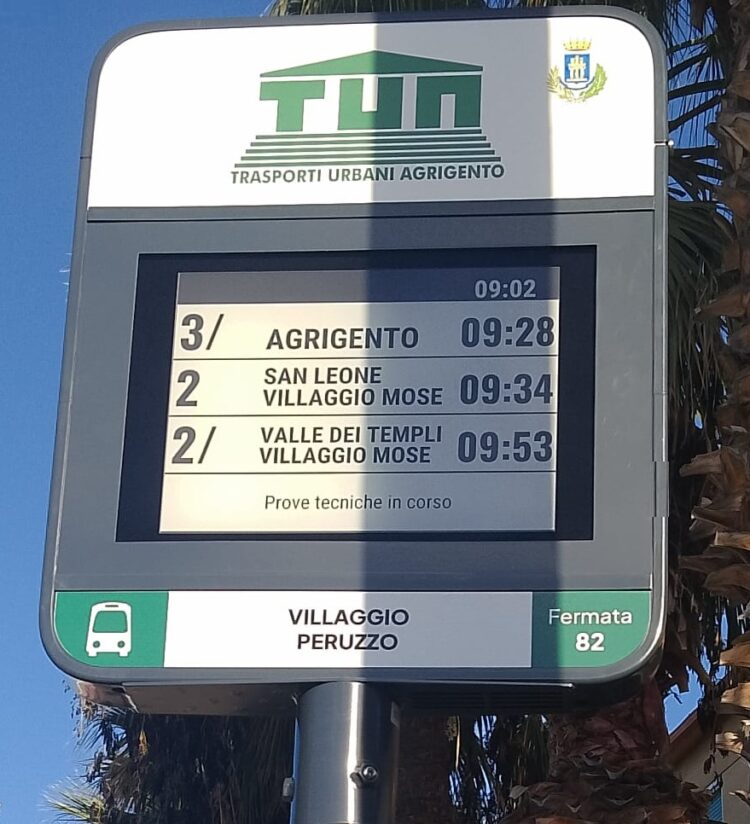 Al via, l’istallazione di 25 pannelli informativi elettronici alimentati a batteria, da istallare alle fermate degli autobus nel territorio di Agrigento. L’utente potrà così conoscere gli orari di passaggio del bus alle fermate in tempo reale mediante un collegamento fisso su rete mobile al sistema centrale di monitoraggio della flotta dell’attuale gestore del trasporto pubblico locale. Un passo in avanti in termini di efficienza sostenuto con i fondi del programma Agenda Urbana, per un importo di 100 mila euro.