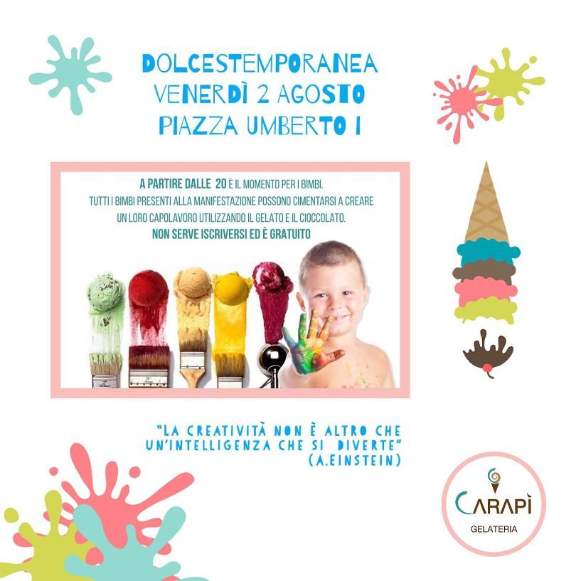 Ad Aragona, domani, venerdì 2 agosto, in piazza Umberto I, presso la nuova gelateria “Carapì”, si svolgerà la manifestazione intitolata “Dolcestemporanea” di pittura e scultura, l’arte prende forma con il gelato ed il cioccolato. Dalle ore 17 in poi, numerosi artisti e semplici appassionati della pittura creativa, si cimenteranno nella realizzazione di disegni e quadri utilizzando il gelato come colore. La particolare estemporanea di pittura è organizzata da Irene Greceffa, titolare della gelateria Carapì di Aragona, in collaborazione con Amedeo Galluzzo e Amelia Russello della scuola di disegno arte e pittura “Arte in corso di Favara”, che sarà presente all’evento insieme ai suoi allievi. All’organizzazione dell’iniziativa “Dolcestemporanea” ha collaborato anche il docente dell’Accademia di Belle Arti e critico d’arte internazionale, Nuccio Mula. I partecipanti sono: Amelia Russello, Amedeo Galluzzo, Anna Lauricella, Luca Zambito, Annalisa Marsala, Adriana Bellavia, Giusy Russello, Antonella Palumbo, Dolores Silveira, Silvana Monteleone, Miriam Russello, Mirella Fiore, Gerlanda Lauricella, Luca Burgio, Rossella Valentina Buscemi, Ylenia Cordaro, Simone De Marco, Filippo Gallea, Lia Piruzza, Annamaria Alongi e Giovanni Rizzo. Per la sezione “giovani” i partecipanti sono: Gabriele Pellegrino, Davide Palumbo, Solead Salamone, Gaia Spoto, Giorgia Spoto, Rosy Miriam Capodici e Luigi Vaccarello. Durante l’evento è previsto anche un momento dedicato ai bambini, con giochi e animazione. Alle 21:30 si terrà la cerimonia di premiazione.