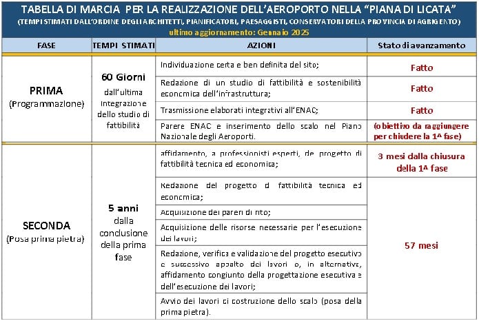 L’inserimento dell’aeroporto della Piana di Licata nella programmazione nazionale, secondo la tabella di marcia ipotizzata dagli architetti, chiuderebbe la prima fase per avviare la seconda, durante la quale, previo reperimento delle risorse necessarie, dovrà essere redatto e approvato il progetto esecutivo e dovranno essere appaltati i lavori. Secondo tale tabella di marcia, per la posa della prima pietra viene stimato un tempo necessario di 60 mesi (cinque anni) dall’inserimento dello scalo nel Piano nazionale degli aeroporti, come risulta dalla tabella allegata, aggiornata a gennaio 2026.