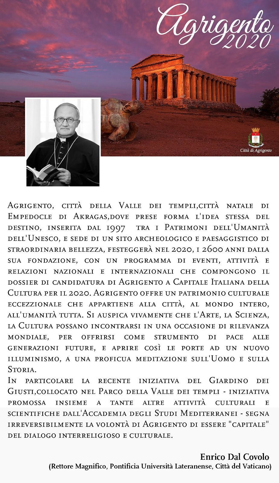 Agrigento – Continuano a pervenire al sindaco Lillo Firetto, note di personalità del mondo accademico a sostegno della candidatura di Agrigento a Capitale Italiana della Cultura 2020. Nelle ultime ore hanno “firmato” l’endorsement l’ex Rettore dell’Università Tor Vergata di Roma, il biochimico Alessandro Finazzi Agrò e il Rettore Magnifico della Pontificia Università Lateranense del Vaticano, Enrico dal Covolo. “Agrigento, città della Valle dei templi,città natale di Empedocle di Akragas,dove prese forma l’idea stessa del destino, inserita dal 1997  tra i Patrimoni dell’Umanità dell’Unesco, e sede di un sito archeologico e paesaggistico di straordinaria bellezza, – scrive Enrico dal Covolo – festeggerà nel 2020, i 2600 anni dalla sua fondazione, con un programma di eventi, attività e relazioni nazionali e internazionali che compongono il dossier di candidatura di Agrigento a Capitale Italiana della Cultura per il 2020. Agrigento offre un patrimonio culturale eccezzionale che appartiene alla città, al mondo intero, all’umanità tutta. Si auspica vivamente che l’Arte, la Scienza, la Cultura possano incontrarsi in una occasione di rilevanza mondiale, per offrirsi come strumento di pace alle generazioni future, e aprire così le porte ad un nuovo illuminismo, a una proficua meditazione sull’Uomo e sulla Storia. In particolare la recente iniziativa del Giardino dei Giusti,collocato nel Parco della Valle dei templi – iniziativa promossa insieme a tante altre attività culturali e scientifiche dall’Accademia degli Studi Mediterranei – segna irreversibilmente la volontà di Agrigento di essere “capitale” del dialogo interreligioso e culturale” Al Rettore Magnifico della Lateranense, fa eco l’ex Rettore dell’Università Tor Vergata, Alessandro Finazzi Agrò: ” “Agrigento – scrive quest’ultimo – rappresenta un unicum culturale dalla sua fondazione ad oggi – malgrado le traversie subite nel corso dei secoli – e non solo per gli immensi contributi alle arti, dall’architettura alla letteratura, ma anche per gli aspetti a me più familiari,per le scienze. Tutti infatti hanno almeno sentito nominare Empedocle e le sue geniali intuizioni filosofiche e scientifiche, ma io vorrei estendere il plauso ad altri, meno universalmente noti, personaggi che hanno illustrato la nostra Agrigento. Mi riferisco, ad esempio a Michele Foderà, grande fisiologo e maestro tra l’altro di Stanislao Cannizzaro che di lui diceva: “Frequentai per tre anni di seguito il corso di Fisiologia del celebre fisiologo Michele Foderà, col quale mi legai in intima amicizia”. Da questi due grandi scienziati trae origine in Italia la disciplina che ho il privilegio di coltivare: la Biochimica. Ma non desidero ulteriormente entrare nell’elenco dettagliato delle personalità agrigentine meritevoli di ricordo, che spero sia attuabile quando Agrigento sarà designata Capitale Italiana della Cultura. Credo siano sufficienti a sostenere la candidatura i famosi versi della XII Pitica di Pindaro: “amante dello splendore, la più bella tra le città dei mortali, dimora di Persefone, bene edificata sopra l’altura sulle rive dell’Akragas…”.