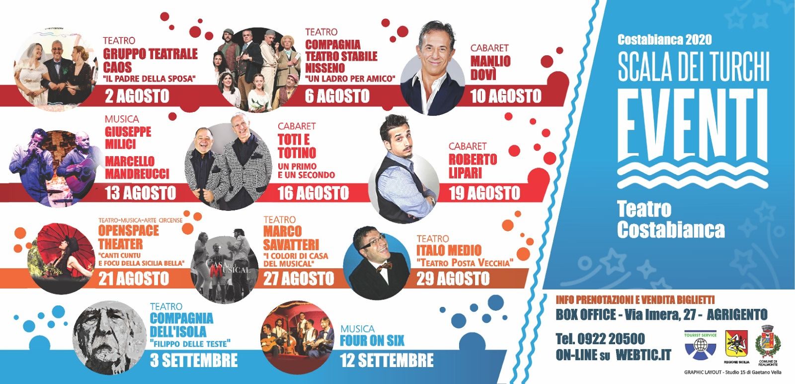 Ecco nel dettaglio il ricco cartellone allestito: si parte il 2 agosto con il gruppo teatrale “Caos”, che proporrà “Il Padre della Sposa”, quattro giorni dopo  protagonista sarà la compagnia “Teatro Stabile Nisseno” con la performance “Un ladro per amico”. Il 10 agosto si cambia genere: arriva il  cabaret di Manlio Dovì, cui seguirà il 13 agosto una serata nel segno della musica con il duo Giuseppe Milici e Marcello Mandreucci.  Ancora un tandem sul palcoscenico: questa volta a calamitare l’interesse del pubblico saranno i due artisti palermitani Toti e Totino con lo spettacolo “Un primo e un secondo” programmato per il 16 agosto. Il cabaret torna a distanza di tre giorni con Roberto Lipari. Il 21 agosto Openspace Theater , il 27 Marco Savatteri con una straordinaria esibizione della Casa del Musical e il 29 andrà in scena Italo Medio, commedia del Teatro Posta Vecchia.  Un interessante appendice caratterizzerà la prima parte di settembre: il 3 è previsto lo spettacolo della Compagnia dell’Isola e il 12 calerà il sipario con Four On Six.  Per info, prenotazioni e vendita biglietti rivolgersi al Box Office, via Imera ad Agrigento, telefono 092220500. I biglietti si possono acquistare anche on line su webtic.it