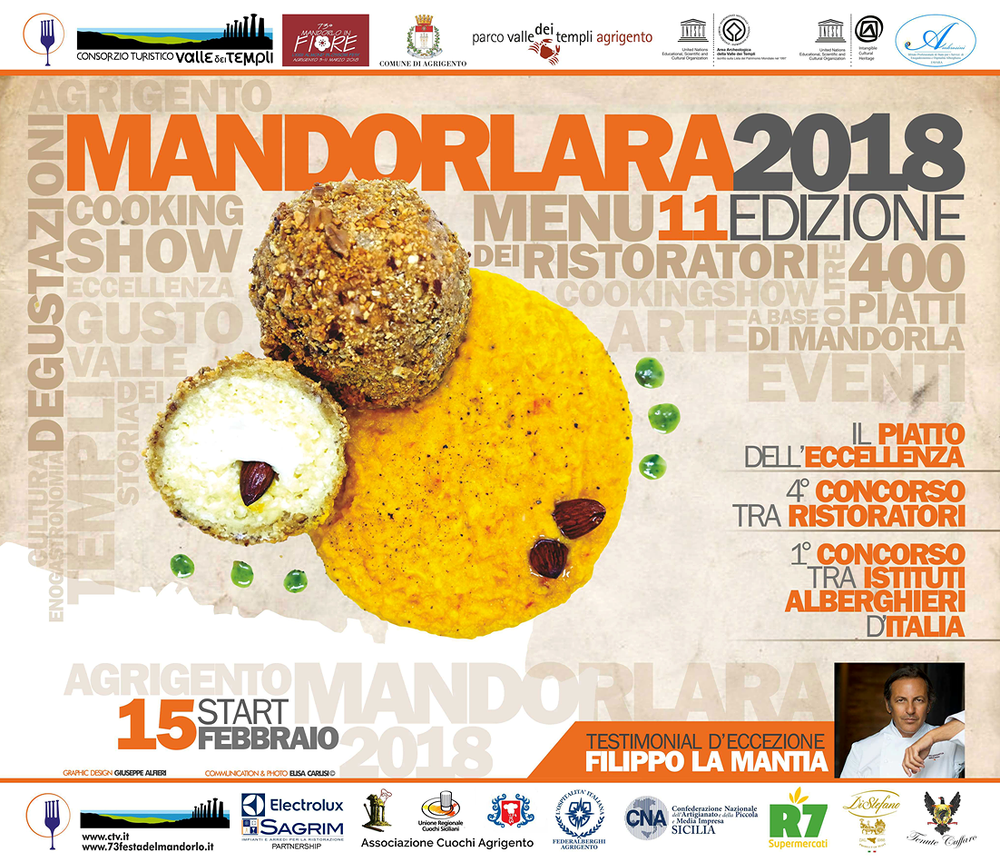 Torna anche quest’anno, dal 15 febbraio al 11 marzo 2018, 11ª Edizione MANDORLARA “LA SAGRA DEL MANDORLO A TAVOLA”, l’importante manifestazione gastronomica ideata ed organizzata da Totó Collura, in collaborazione con il Consorzio turistico Valle dei Templi di Agrigento, nella figura del neopresidente Emanuele Farruggia.