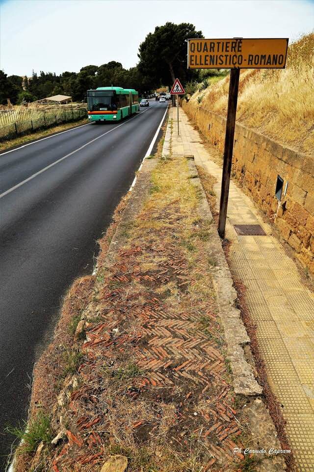 Una porzione di pavimentazione a lisca di pesce del decumano, strada romana di solito da est a ovest, nella Valle dei Templi di Agrigento, coperta dalla strada a fianco asfaltata. A denunciarlo con rabbia, Alfredo Prado, pittore e grafico di riconosciuta autorevolezza, direttore Accademia Belle Arti “Michelangelo” e adesso anche mecenate nella sua Agrigento.