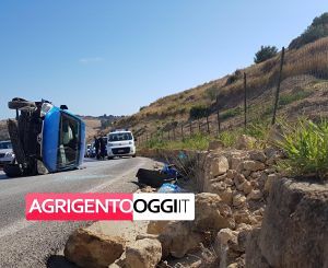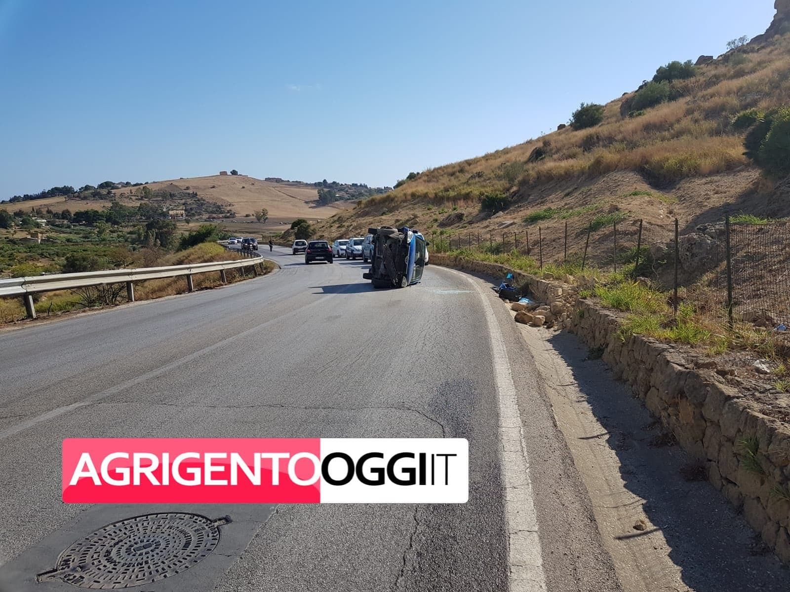 Una  Hyundai i10 di colore blu si è ribaltata nel pomeriggio di oggi lungo la Via Panoramica dei Templi. A bordo una donna anziana, R.S., che, per cause da accertare, ha perso il controllo del mezzo che ha sbattuto contro un muretto e poi si è appunto ribaltato.
