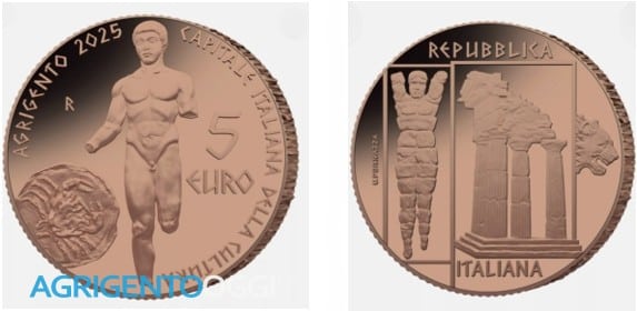 Nel giro della moneta si trovano le scritte “Agrigento 2025” e “Capitale Italiana della Cultura”, a sottolineare il prestigioso riconoscimento ricevuto dalla città. In alto a sinistra è presente il segno di spunta, mentre a destra il valore “5 euro” .