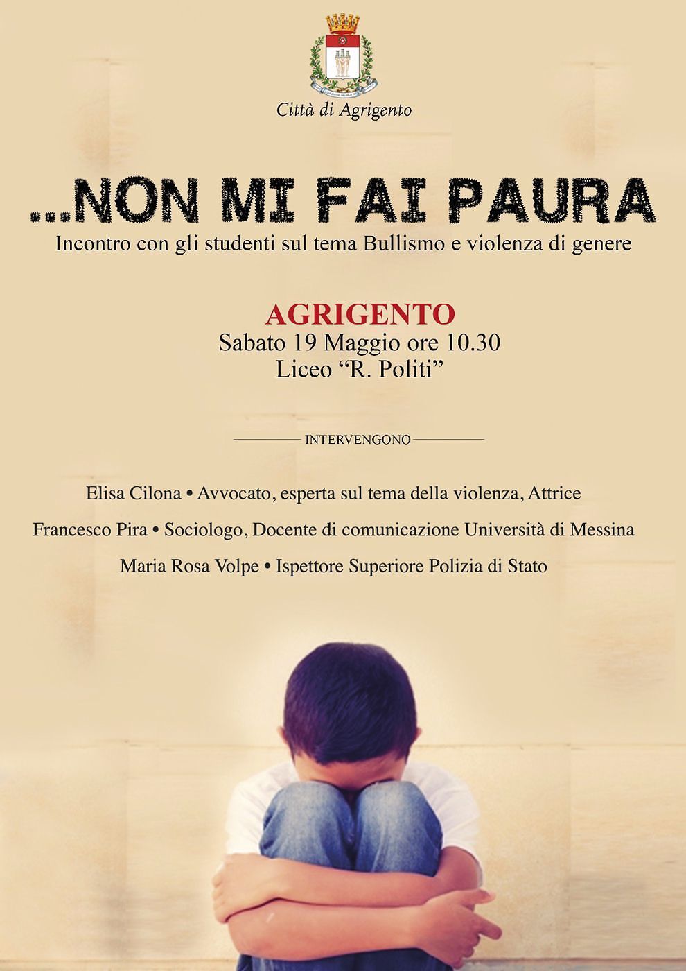 AGRIGENTO – “Non mi fai paura” è il titolo di un convegno, organizzato con il patrocinio dell’Amministrazione Comunale, alle 10 e 30 di sabato 19 maggio presso il Liceo Politi di Agrigento sul tema del bullismo e della violenza di genere. Interverranno: Elisa Cilona, esperta sul tema della violenza; Francesco Pira, sociologo presso l’Università di Messina e Maria Rosa Volpe, ispettore superiore della Polizia di Stato.