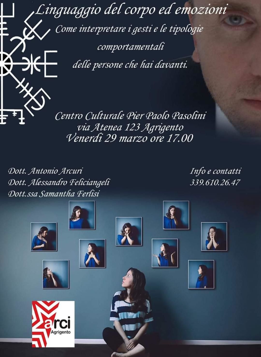 Giorno 29 marzo 2019 alle ore 17.00 presso il Centro Culturale Pier Paolo Pasolini di Agrigento via Atenea via 123 si terrà un Convegno sul ”Linguaggio del corpo ed emozioni: come interpretare i gesti e le tipologie comportamentali delle persone che hai davanti”.