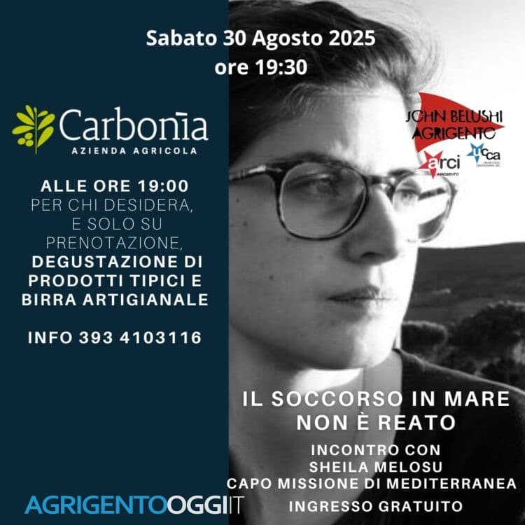 AGRIGENTO – Sabato 30 agosto 2025, alle ore 19:30, presso l’azienda agricola Carbonia, si terrà un incontro pubblico dal titolo “Il soccorso in mare non è reato”, organizzato dall’azienda agricola Carbonia in collaborazione con Arci Agrigento e John Belushi Agrigento.