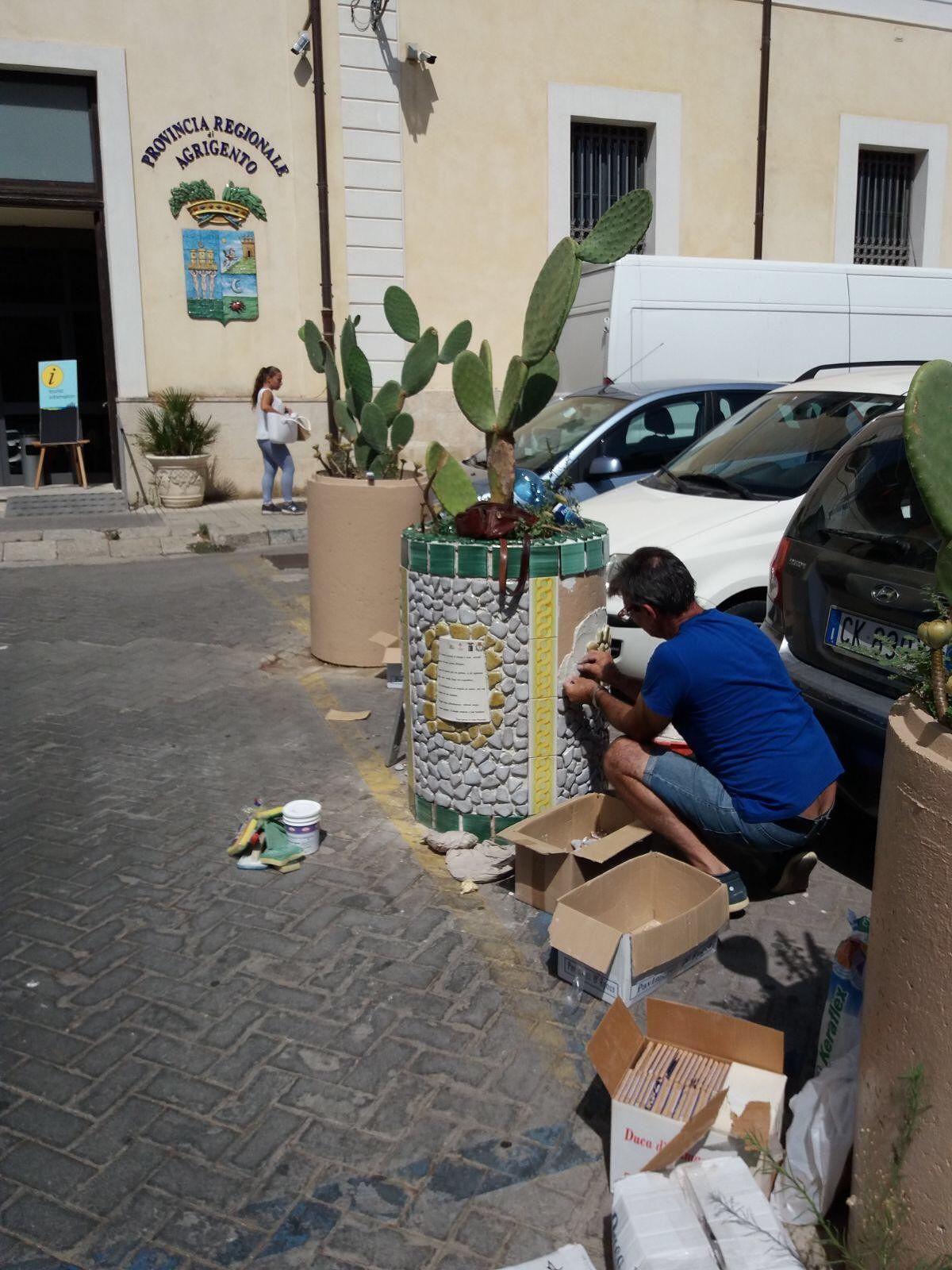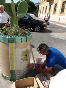 Sono ripresi questa mattina in Piazza Vittorio Emanuele, i lavori di rivestimento artistico dei vasi cilindrici con piastrelle maiolicate che delimitano gli spazi adibiti al parcheggio ed al transito pedonale.