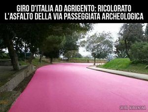 Intanto a smorzare la rabbia ci pensa la Satira Agrigentina con le lapazze rosa e l’asfalto ridipinto dello stesso colore, il colore del Giro.