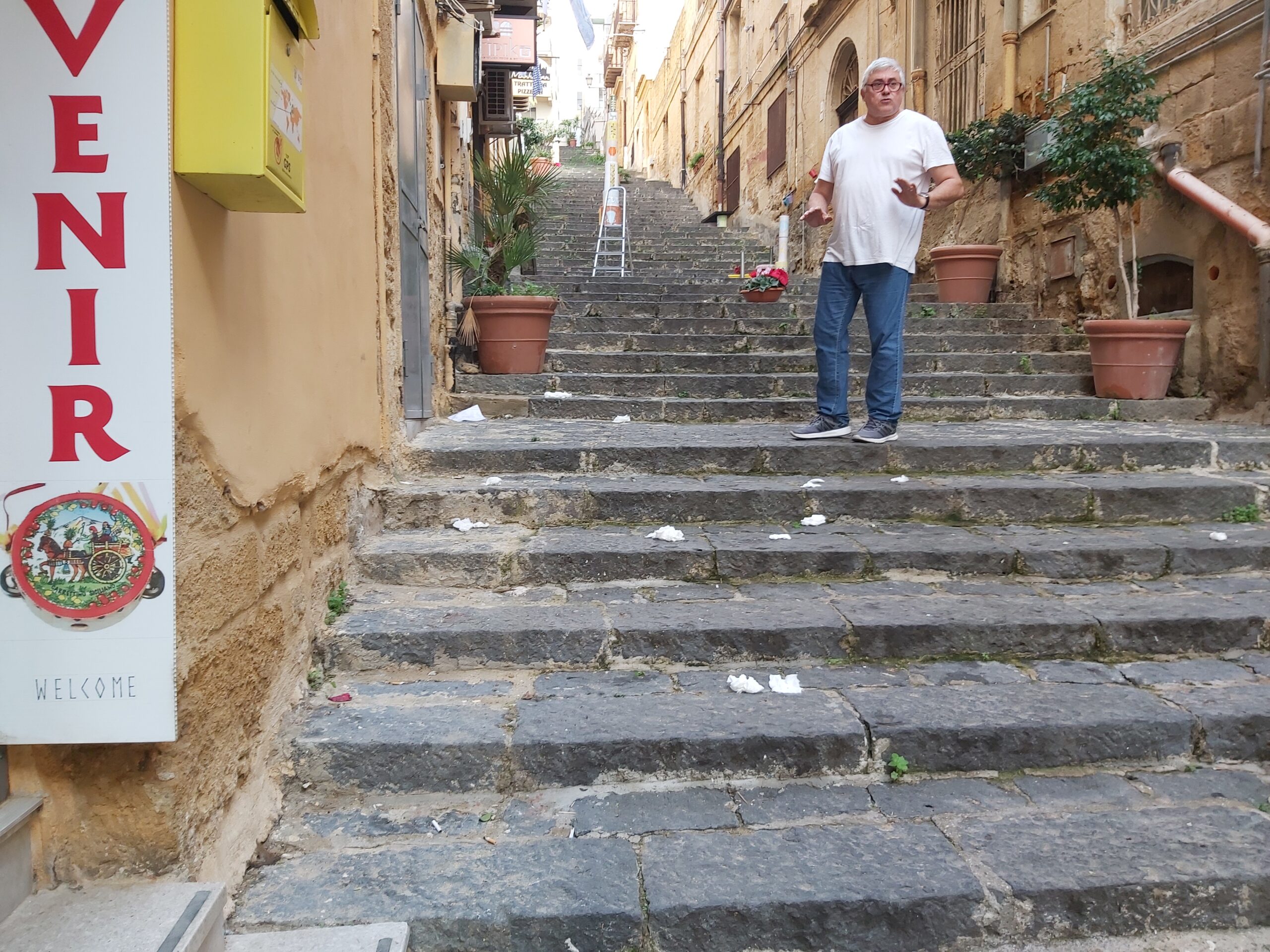 E’ stato ripreso dalla telecamera mentre stava depositando alcuni sacchetti pieni di spazzatura sul marciapiede, della via Atenea, e multato di 600 euro. In realtà le cose non sono andate così. Il protagonista della vicenda è Dario Tuttolomondo, titolare insieme alla figlia di due attività di ristorazione “Manhattan” e “Tipiko”, lungo la scalinata più fotografata dai turisti, proprio all’ingresso della via Atenea. Nel momento in cui è stato filmato stava semplicemente spostando di un paio di metri i rifiuti lasciati sulla scala, anziché differenziarli, da più incivili residenti del centro storico.