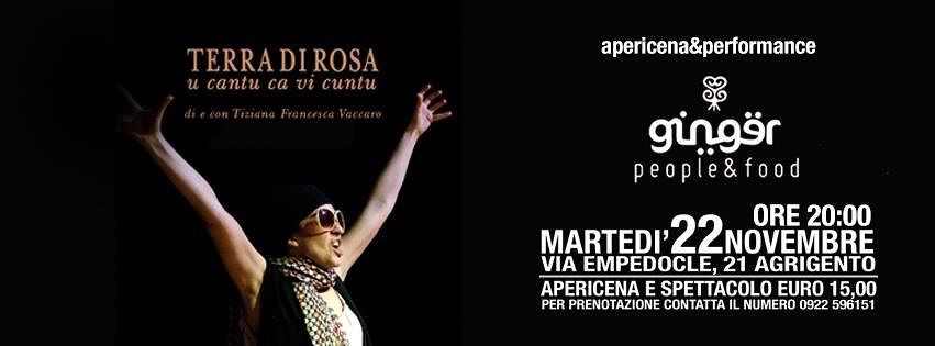 Terzo appuntamento, al Ginger people&food, di “Ginger Unplugged“, dedicato al teatro, con un monologo della catanese Tiziana Francesca Vaccaro, attrice emergente che tanto successo riscuote in giro per l’Italia con questo lavoro. Vaccaro, proporrà “Terra di Rosa”, basato sulla vita di Rosa Balistreri.