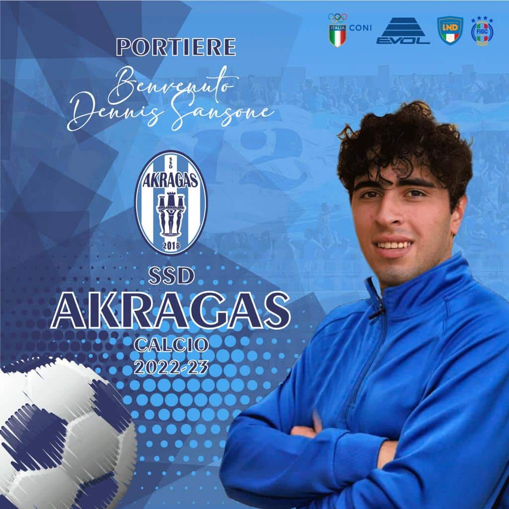 Nuovo arrivo in casa Akragas. La Società del Presidente Giuseppe Deni è lieta di annunciare la firma in biancoazzurro del giovane e talentuoso portiere classe 2002, Dennis Sansone, nell’ultima stagione alla Sancataldese in Serie D. Originario di Mazara del Vallo, Dennis Sansone è alto 185 cm ed è cresciuto calcisticamente nel Trapani. Nel recente passato ha difeso la porta della Folgore di Castelvetrano, mettendosi in luce a suon di prestazioni positive che gli hanno permesso di guadagnarsi il titolo di miglior portiere juniores del campionato di Eccellenza. Il Direttore sportivo dell’Akragas Ernesto Russello, che lo scorso anno ha lavorato con Sansone nella Sancataldese, conferma le ottime capacità balistiche del giovane portiere che oggi si è legato al club biancoazzurro per la stagione 2022-2023.