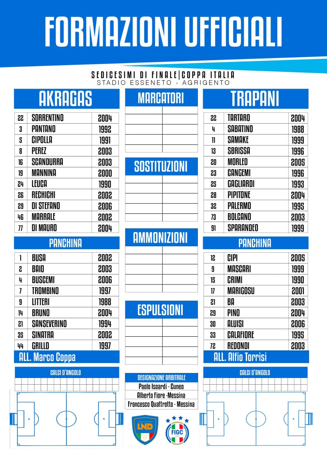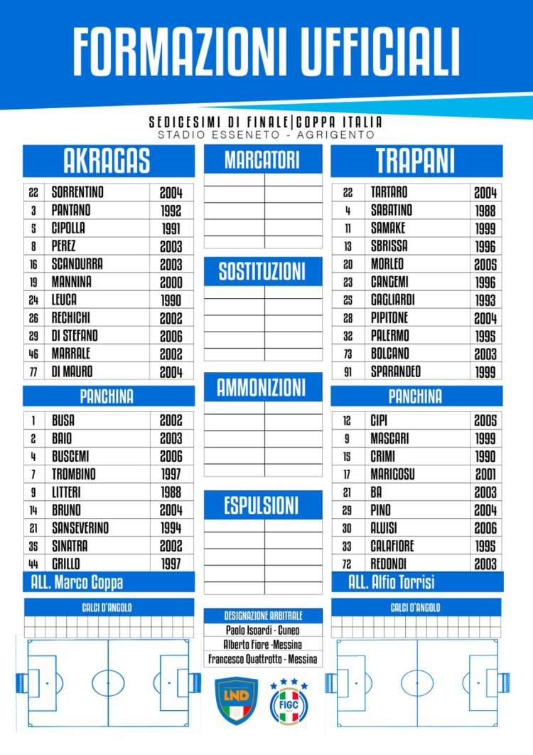 Akragas così in campo: Surreniinu tra i pali, Difensori: Pantano, Cipolla, Perez, Scandurra, Centrocampisti: Mannina, Leuca, Rechichi, Attaccanti: Di Siefano, Marrale, Di Mauro. In panchina: Busa, Baio, Buscemi, Trombino, Litteri, Brund, Sanseverino, Sinatra, Grillo. Marco Coppa (presumibilmente l’allenatore o un membro dello staff tecnico).