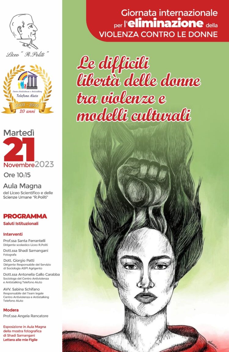 Dopo il saluto introduttivo del Dirigente Scolastico Prof.ssa Santa Ferrantelli, della referente delle attività, la Prof.ssa Angela Rancatore e delle autorità presenti, interverranno la fotografa iraniana Shadi Samangani che illustrerà la mostra allestita in Aula Magna dal titolo Lettera alle mie figlie, il Dott. Giorgio Patti, Dirigente responsabile del servizio di Sociologia ASP1 Agrigento, la Dott.ssa Antonella Gallo Carrabba, sociologa del Centro Antiviolenza e l’Avv. Sabina Schifano del Centro Antiviolenza Antistalking Telefono Aiuto che presenteranno una realtà più vicina a noi, quella in cui le donne sono vittima ogni giorno di violenza e discriminazioni tra le mura domestiche, sul posto di lavoro e nella società e l’importanza di “conoscere” per “proteggersi”.