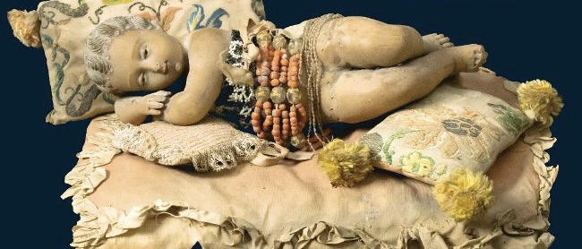 Bambinelli Gesù in cera, dormienti, assisi, sorridenti o con il cuore in mano, in fasce o in abitini, questi i principali soggetti che plasmati e declinati in molteplici posture e espressioni costituiscono il corpus di opere scelte per questa esposizione, pregevoli manufatti provenienti dal Monastero delle Benedettine e dal Collegio di Maria di Palma di Montechiaro e da collezioni private la cui simbologia rimanda alla profezia di Isaia sul virgulto di Iesse. La scenografia che accoglie le piccole sculture di Gesù Bambino in cera è quasi sempre un lirico inno al mondo floreale che prefigura l’identità del Salvatore e richiama l’innocenza infantile.
