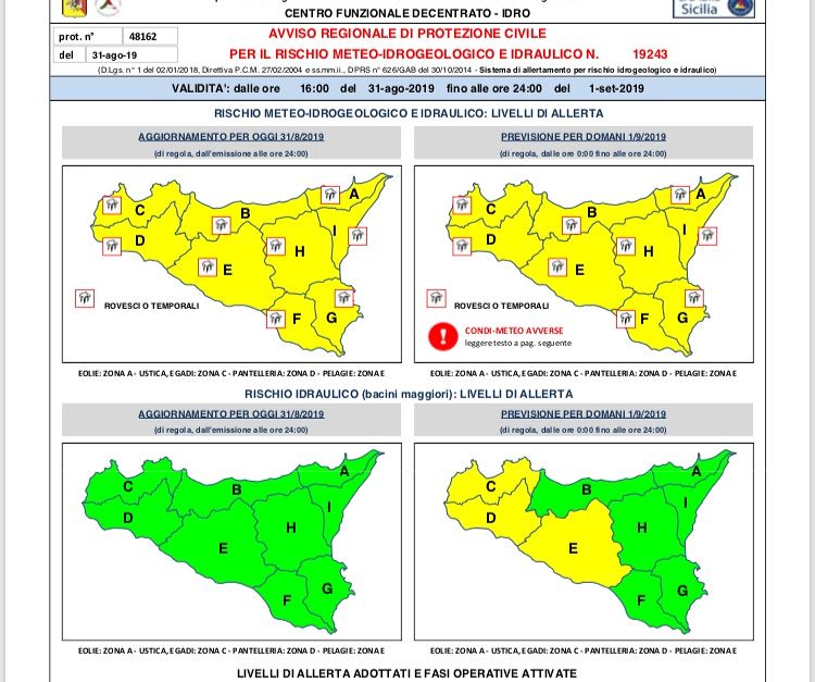 Il Dipartimento Regionale di protezione civile ed il centro funzionale multirischi integrato della Regione Sicilia hanno emanato un nuovo bollettino per rischio Meteo idrogeologico ed idraulico valevole dal pomeriggio di oggi 31/08 e fino alle ore 24.00 di domani 01/09 causa condizioni meteo avverse su tutta la regione fissando il livello di allerta in giallo e la fase operativa di Attenzione. Vista la possibilità di rovesci o temporali l’ufficio comunale di protezione civile avverte la popolazione di usare estrema cautela in caso di criticità, soprattutto nelle zone precedentemente interessate da problemi , ed avvisa che monitorerà eventuali situazioni di potenziale rischio sul territorio.