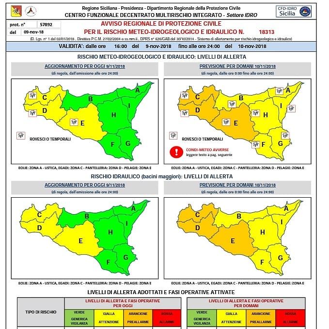 Il dipartimento regionale della protezione civile ha diramato un avviso di allerta meteo, classificato “arancione” e cioè di preallarme, dalla mezzanotte di oggi e fino alle ore 24 di domani, sabato 10 novembre, per avverse condizioni meteo.Si prevedono, infatti, precipitazioni anche a carattere di rovescio o temporali sui settori occidentali e versanti meridionali centrali della Sicilia con quantitativi cumulabili da elevati a molto elevati. Il Sindaco Firetto ha firmato la relativa ordinanza che prevede, tra l’altro, l’interdizione delle aree pubbliche potenzialmente a rischio quali giardini pubblici, impianti sportivi all’aperto, aree giochi esterne, cimiteri e sottopassi. L’interdizione e l’uso temporaneo dei locali interrati, seminterrati e bassi sopratutto nelle vie interessate dalla recente esondazione e ubicate sul lato fiume del viale Emporium e la sospensione di tutte le manifestazioni all’aperto nonché delle attività commerciali su strada e aree pubbliche anche se precedentemente programmate..