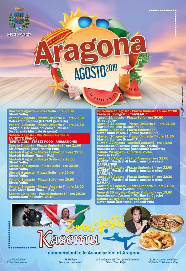 Anche il mese di Agosto sarà ricco di eventi ad Aragona, organizzati dall’amministrazione comunale, presieduta dal sindaco Giuseppe Pendolino, in collaborazione con l’assessorato allo Spettacolo, presieduto dal vice sindaco Franco Virone, e con il fattivo contributo delle varie associazioni del territorio e i commerciati di Aragona. Un mese di agosto tra feste, fiere, notte bianca, sport, musica, concerti, spettacoli, teatro, presentazione di libri, appuntamenti per bambini e intrattenimento. Coinvolte le piazze, le periferie, le principali via del paese e i tanti locali, tra pub, bar e ristoranti. Riflettori puntati sulla festa dell’ “Emigrato”, in programma il prossimo 11 agosto, alle ore 21, in piazza Umberto I, con lo spettacolo di musica popolare con canti, filastrocche, cunti e serenate della tradizione siciliana ad opera del gruppo “Kasemu”, fondato da Filippo Lo Brutto e Peppe Ballacchino nel lontano 1990. In calendario anche l’AgricoolTour, “Zorba in festa”, incontri con l’autore con Alan David Scifo, Alessandro Cacciato e Martino Lo Cascio.