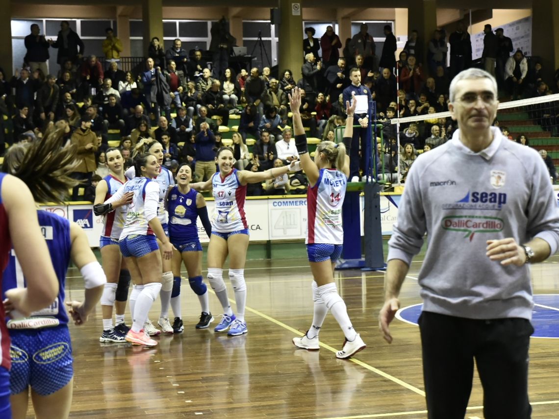 Vittoria facile, come da pronostico della vigilia, per la Seap Dalli Cardillo Aragona che regola con un secco 3-0 il Volley Palmi, formazione che occupa l’ultimo posto della classifica con soli 2 punti. La partita era valida per la seconda giornata di ritorno del campionato di serie B1, girone D. Questi i parziali al palasport Pippo Nicosia di Agrigento: 25-14, 25-15, 25-20. I tre punti hanno permesso al sestetto del presidente Nino Di Giacomo di rimanere al secondo posto della classifica, ad un solo punto dalla capolista Cerignola, che ha espugnato il campo del forte Arzano per 3-0. Il neo coach dell’Aragona, Massimo Dagioni, ha schierato il sestetto tipo con Trabucchi in palleggio, Aricò opposto, Manzano e Composto centrali, Donà e Moneta schiacciatrici, Parisi libero. Nel corso del match sono entrate il secondo libero Ruffa e la schiacciatrice Falcucci. Il Volley Palmi, allenato da Enzo Celi, ha risposto con Marchi in regia, Varaldo opposto, La Rosa e Cantamessa al centro, Buonfiglio e Fiore martelli-ricevitori, Giudice libero. Sono subentrate dalla panchina Aprile, De Santis e Carrozza.