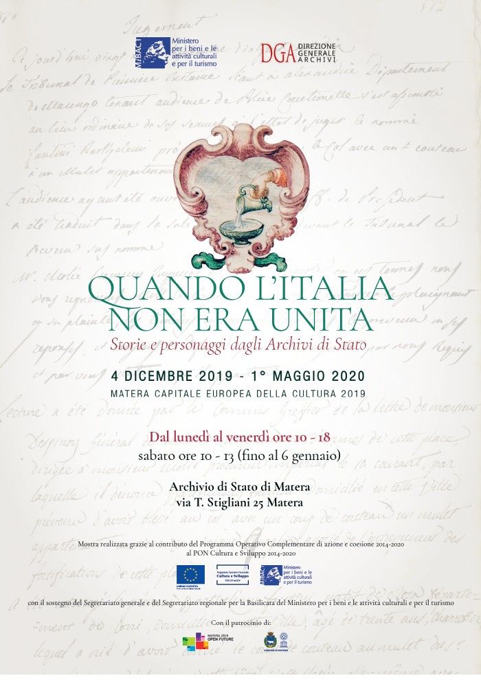 Il 4 dicembre 2019 alle ore 17.00 si inaugura presso l’Archivio di Stato di Matera la mostra documentaria Quando l’Italia non era unita. Storie e personaggi dagli Archivi di Stato, organizzata dalla Direzione Generale Archivi nel quadro delle iniziative per Matera Capitale Europea della Cultura 2019, grazie alla collaborazione di 16 Archivi di Stato, tra i quali l’Archivio di Stato di Agrigento con il prestito di un documento sul Molo di Girgenti.