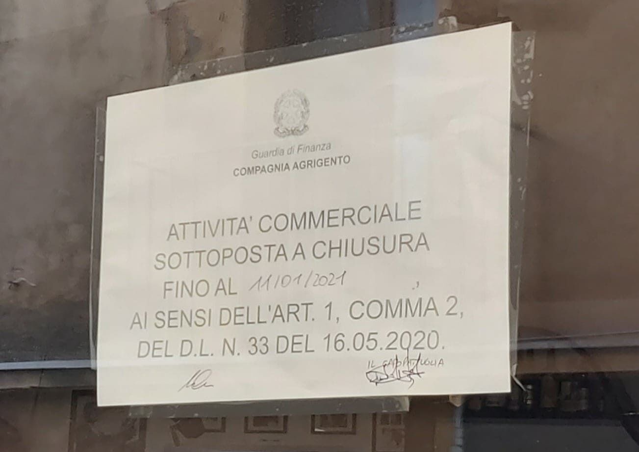 Sempre i finanzieri del Compagnia agrigentina, la vigilia dell’Epifania, con l’Italia in zona “rossa”, hanno multato 400 euro “a testa”, e fatto chiudere, anche in questo caso, per la durata di 5 giorni, due autolavaggi in territorio di Agrigento.