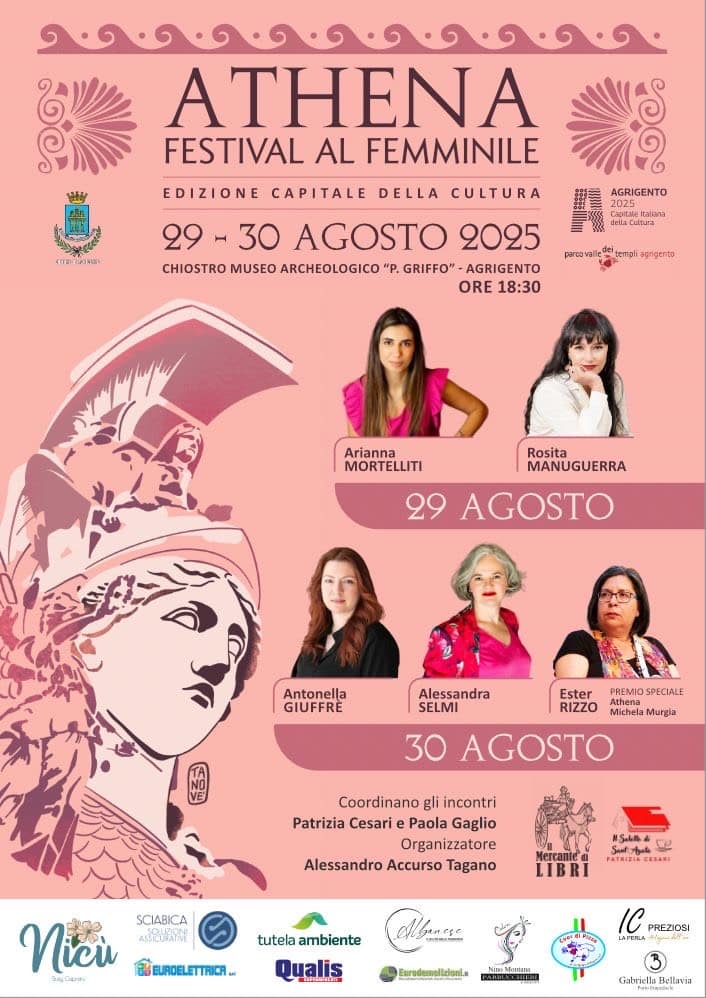 AGRIGENTO – Il 29 e 30 agosto, nella suggestiva cornice del Chiostro del Museo Archeologico “Pietro Griffo”, torna per la sua quarta edizione l’Athena Festival, l’unico festival letterario al femminile esistente in Italia.