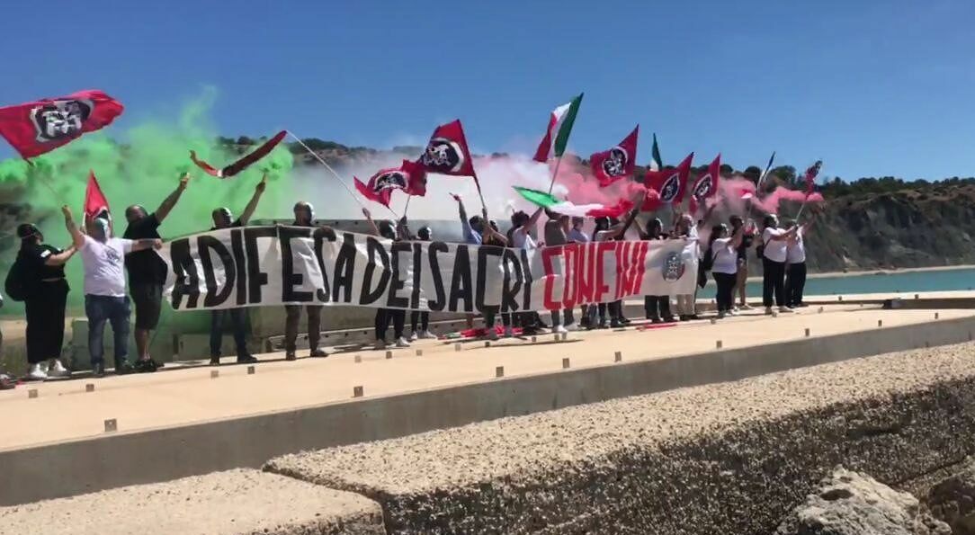 Fumogeni, bandiere tricolori e cori scanditi dietro allo striscione “A DIFESA DEI SACRI CONFINI”. “Questo per noi è un concetto fondamentale – spiega la nota di CasaPound -. I confini italiani ed europei sono sacri ed inviolabili in quanto solcati dal sangue dei nostri eroi e dei nostri padri, e non possono essere bistrattati oggi dai signori del globalismo per meri interessi economici. In un Mar Mediterraneo che ci vede oramai come delle comparse, dove i nostri pescherecci vengono presi a sassate ed a mitragliate da chiunque, con i nostri politicanti che non sanno difendere la sovranità italiana facendoci ridicolizzare dinanzi al mondo intero, noi abbiamo voluto affermare un principio sacrosanto”.
