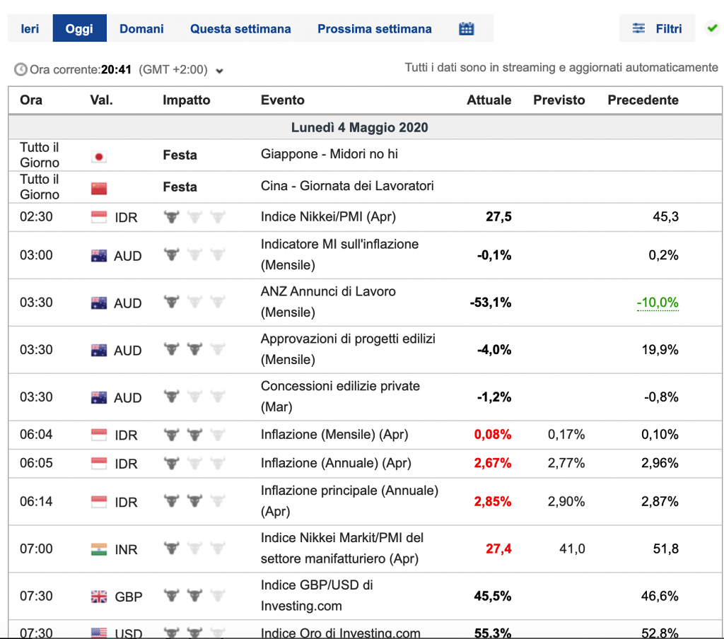 Quando si trovano segni rossi, il livello di impatto dell’evento è “Alto”. Quindi viene indicato che arriverà un’emissione di dati significativa. Molto probabilmente il mercato in questione si sposterà in maniera importante.