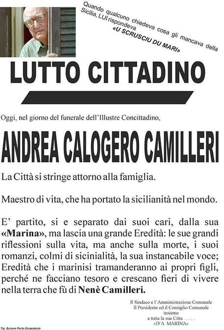 Accenti e punteggiatura alla rinfusa e un termine con dei refusi evidenti. Sta facendo discutere, e non solo sui social, il manifesto di lutto cittadino, con la foto di Andrea Camilleri, che era stato collocato ieri accanto alla statua del commissario Salvo Montalbano in via Roma a Porto Empedocle (Ag). Un manifesto che è stato rifatto, pare, tre volte, ma la cui foto della prima versione rimbalza ancora sui social. “Sono indignata, è un’operazione per buttare fango su Porto Empedocle e in un momento tanto delicato di dolore per la città, la nazione e l’umanità – commenta il sindaco Ida Carmina, ieri a Roma – c’è una campagna denigratoria in atto, ma non potrà scalfire l’immagine di Porto Empedocle e di quello che questa città è stata per Camilleri. Sono stati errori tipografici e mi dicono che il tipografo, fortemente turbato, non è riuscito a controllare la bozza. Stigmatizzo questa macchina del fango ad opera di leoni di tastiera e avrò modo di valutare un’azione giudiziaria”.