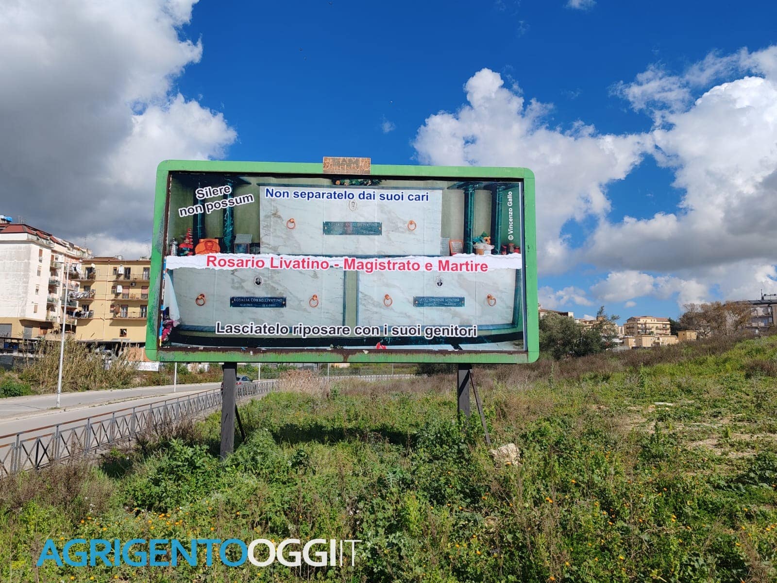 “Rosario Livatino, magistrato e martire. Lasciatelo riposare con i suoi genitori, non separatelo dai suoi cari. Silere non possum (non posso tacere)”, citando Sant’Agostino. Queste le parole che, da ieri, compaiono su cartelloni stradali affissi nelle principali vie di Canicattì, in memoria del giudice Rosario Angelo Livatino e dei suoi genitori. L’iniziativa è stata promossa dal giornalista Vincenzo Gallo, cugino del magistrato ucciso dalla mafia il 21 settembre 1990 in un agguato a Contrada Gasena, alle porte di Agrigento. Il messaggio è stato accolto anche da gruppi di cittadini, singoli e associazioni che si oppongono alla traslazione della salma di Livatino.