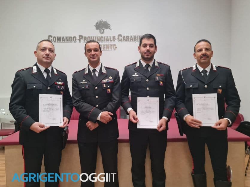 Nella sede del Comando provinciale Carabinieri di Agrigento, il comandante provinciale, colonnello Nicola De Tullio, ha consegnato tre formali compiacimenti del comandante della Legione Carabinieri “Sicilia”, generale di brigata Ubaldo Del Monaco, a tre militari distintisi per elevata professionalità, prontezza operativa e spirito di servizio in occasioni che hanno consentito di scongiurare gravi conseguenze per l’incolumità delle persone.