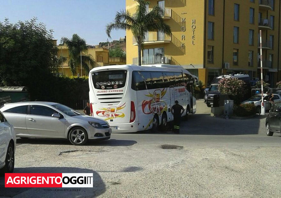 Come un gigante risucchiato dalle sabbie mobili, intorno alle 16,45, un bus turistico è rimasto incastrato, senza possibilità di uscirne...