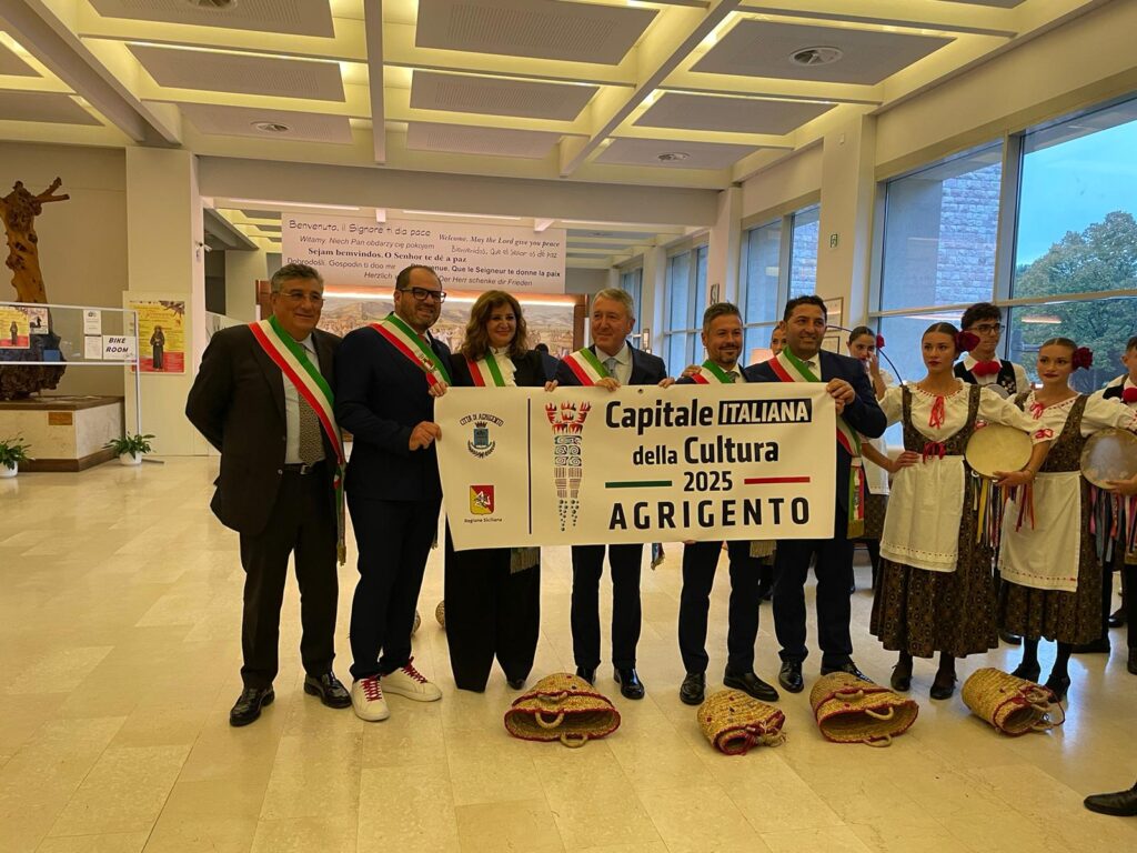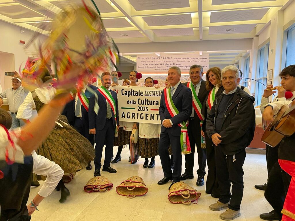 La compagnia di folklore Val d’Akragas è stata particolarmente apprezzata in occasione delle celebrazioni per la festa del patrono d’Italia dedicata a San Francesco in corso di svolgimento ad Assisi. La Regione Siciliana con in testa il Presidente Renato Schifani e una massiccia presenza dei Sindaci della Sicilia insieme al Sindaco di Assisi hanno preso parte alle iniziative iniziate oggi presso la Basilica di Santa Maria degli Angeli. Prima dell’ingresso in Basilica si è svolto un incontro istituzionale culminato in un lungo corteo tra gonfaloni di tutta la Sicilia ed i rappresentanti istituzionali presenti ad Assisi. L’incontro è stato preceduto da un momento di spettacolo offerto dalla compagnia di Agrigento, inscritta al Registro delle eredità immateriali della Regione Siciliana, che ha accompagnato il Sindaco di Agrigento, l’assessore al turismo Costantino Ciulla ed i tanti sindaci della provincia. Presente, tra gli altri, il presidente del parco archeologico Giuseppe Parello che ha curato l’evento.