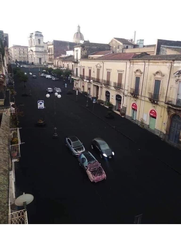 (Nella foto: il corso principale di Giarre, ricoperto di cenere)