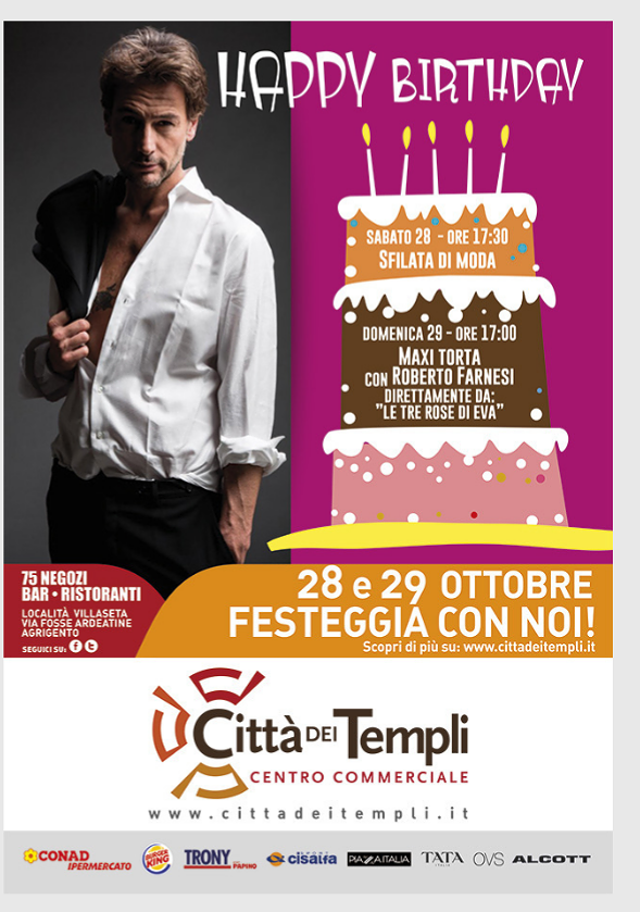 Domenica 29 Ottobre dalle h17.00 ci sará il bellissimo Roberto Farnesi ad omaggiare con la sua presenza la Maxi Torta del centro commerciale offerta a tutti.