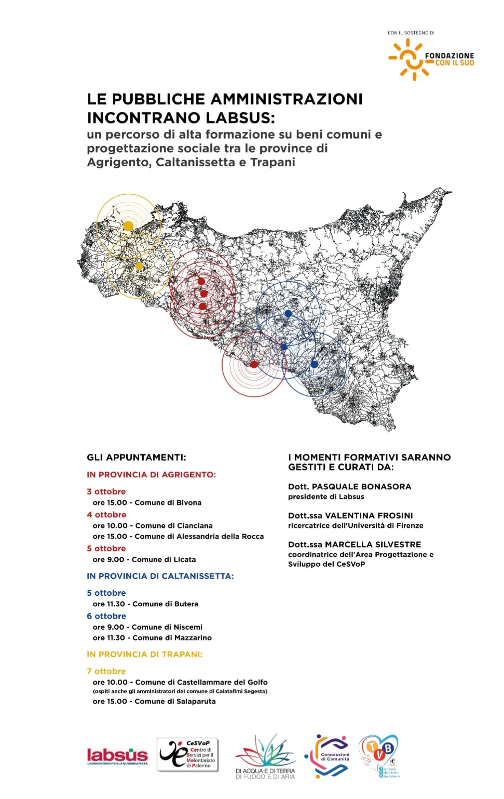 A partire dal 3 ottobre 2022 la Sicilia ospiterà una serie di incontri istituzionali con il coinvolgimento di associazioni e cittadini mirati a spiegare e raccontare l’Amministrazione Condivisa, il percorso per attuarla e quali obiettivi si pone: un vero e proprio tour organizzato dal CeSVoP, il Centro di Servizi per il Volontariato di Palermo, insieme a diverse associazioni delle province di Agrigento, Caltanissetta e Trapani all’interno dei progetti “Di Acqua e Di Terra, Di Fuoco e di Aria”, “Connessioni di Comunità” e “TVB – Territorio Volontariato Bene Comune”, realizzati con il sostegno di Fondazione Con il Sud.