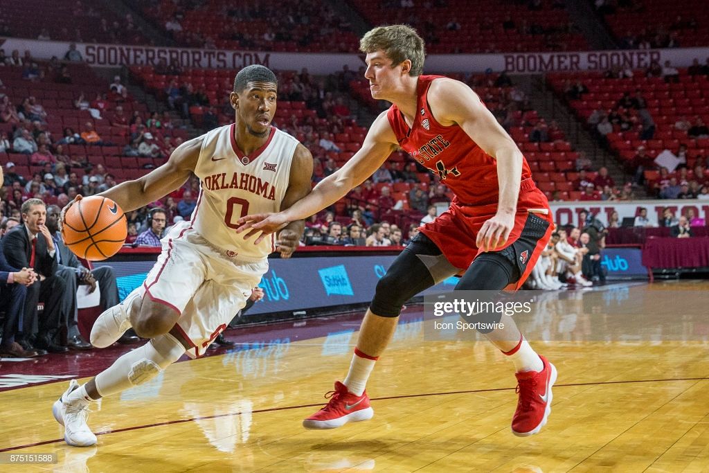 NORMAN, OK - NOVEMBER 15: Christian James (0) of the Oklahoma Sooners drives to the basket against Blake Huggins (44) of the Ball State Cardinals during the Oklahoma Sooners against the Ball State Cardinals at the Lloyd Noble Center in Norman, Ok. (Photo by Richard Rowe/Icon Sportswire via Getty Images)