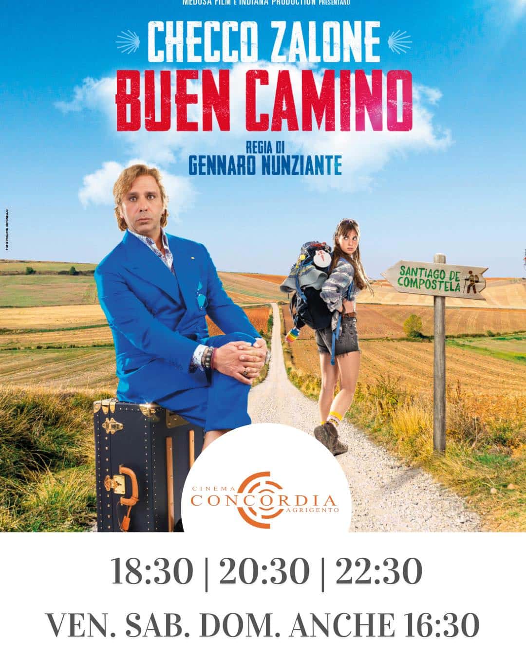 Al Cinema Concordia è in programmazione Buen Camino, la nuova commedia di Checco Zalone diretta da Gennaro Nunziante. Il film viene proiettato tutti i giorni alle 18.30, 20.30 e 22.30, con uno spettacolo aggiuntivo alle 16.30 nelle giornate di venerdì, sabato e domenica.