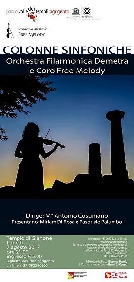 Il Parco Archeologico della Valle dei Templi, Lunedì 7 Agosto, presenta il concerto dell’Orchestra Filarmonica Demetra e il Coro Free Melody, con ingresso a pagamento di Euro 5,00 dalla biglietteria del Tempio di Giunone alle ore 21,00.