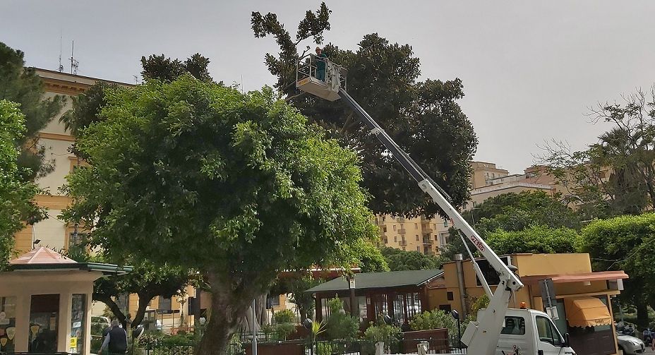 La ditta incaricata dal Comune di Agrigento è nuovamente tornata a Porta di Ponte, per ultimare l’intervento di potatura del Ficus “Magnoloides”, nei giardini di piazza Aldo Moro. Alcuni operai, con una gru, comprendente il relativo cestello, e con l’uso di motoseghe hanno completato il taglio dei rami, pronti a collassare da un momento all’altro, dell’albero proprio di fronte il “Bar Milano”.