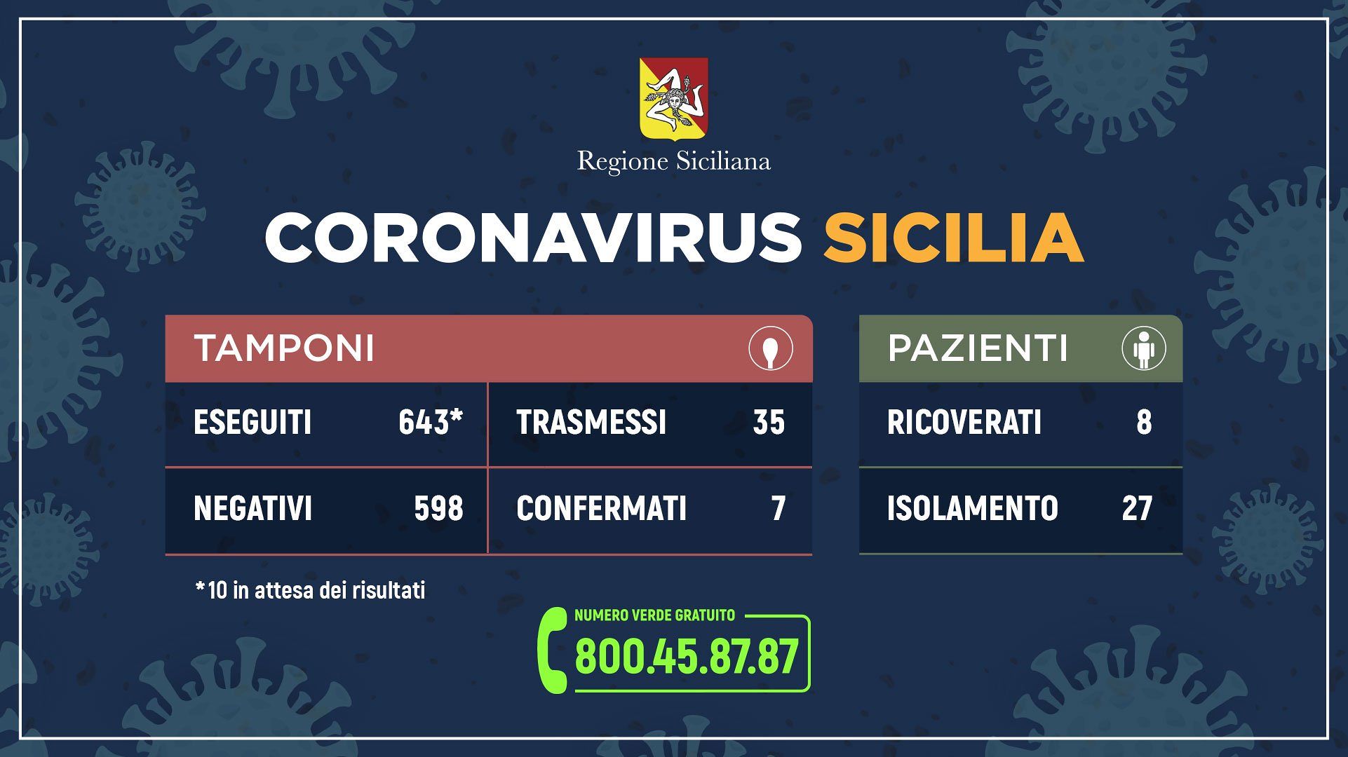 Dalla Sicilia sono stati trasmessi all’Istituto superiore di sanità 35 campioni relativi al coronavirus, di cui sette già validati da Roma (tre a Palermo e quattro a Catania). Sono quindi 35 le persone risultate positive in Sicilia, 11 più di ieri. Risultano ricoverati 8 pazienti (tre a Palermo, tre a Catania, uno a Messina, uno a Caltanissetta, ma proveniente da Agrigento) di cui nessuno in regime di terapia intensiva, mentre 27 sono in isolamento domiciliare.